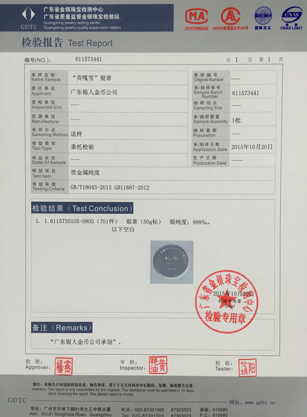 • 廣東省質監白銀純銀紀念幣章檢驗報告