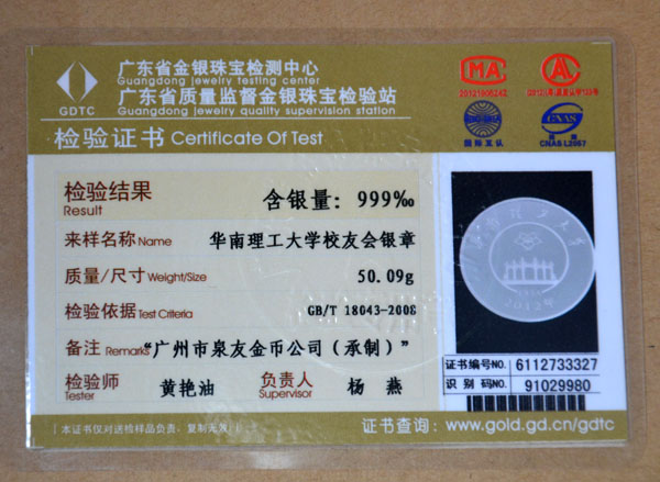 • 華南理工大學(xué)校友會紀(jì)念銀章檢測證書