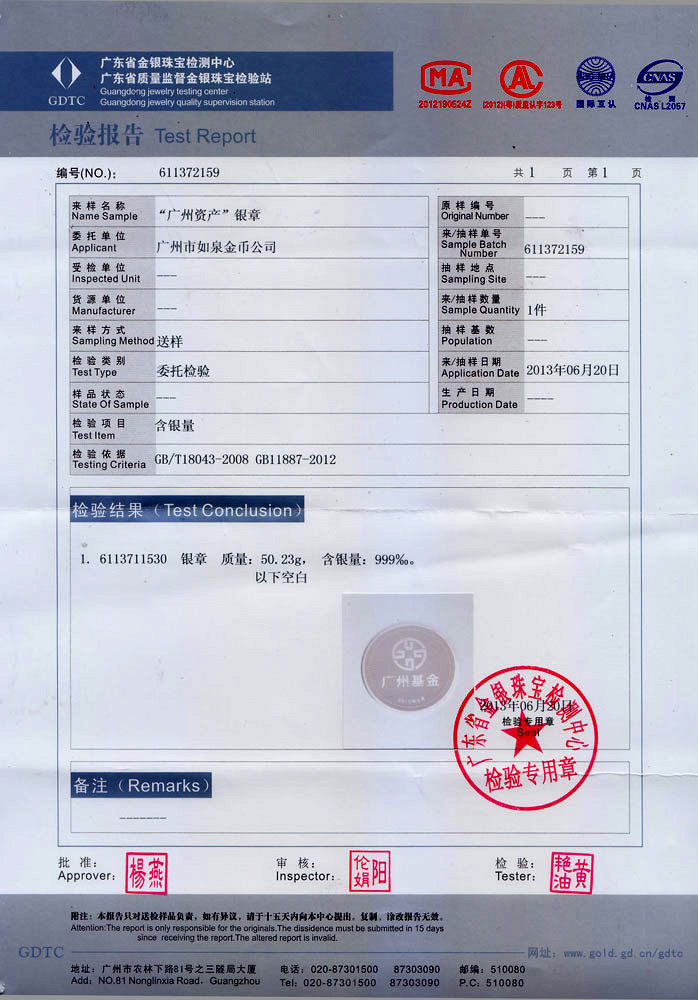 • 廣東省質(zhì)監(jiān)純金純銀檢測證書