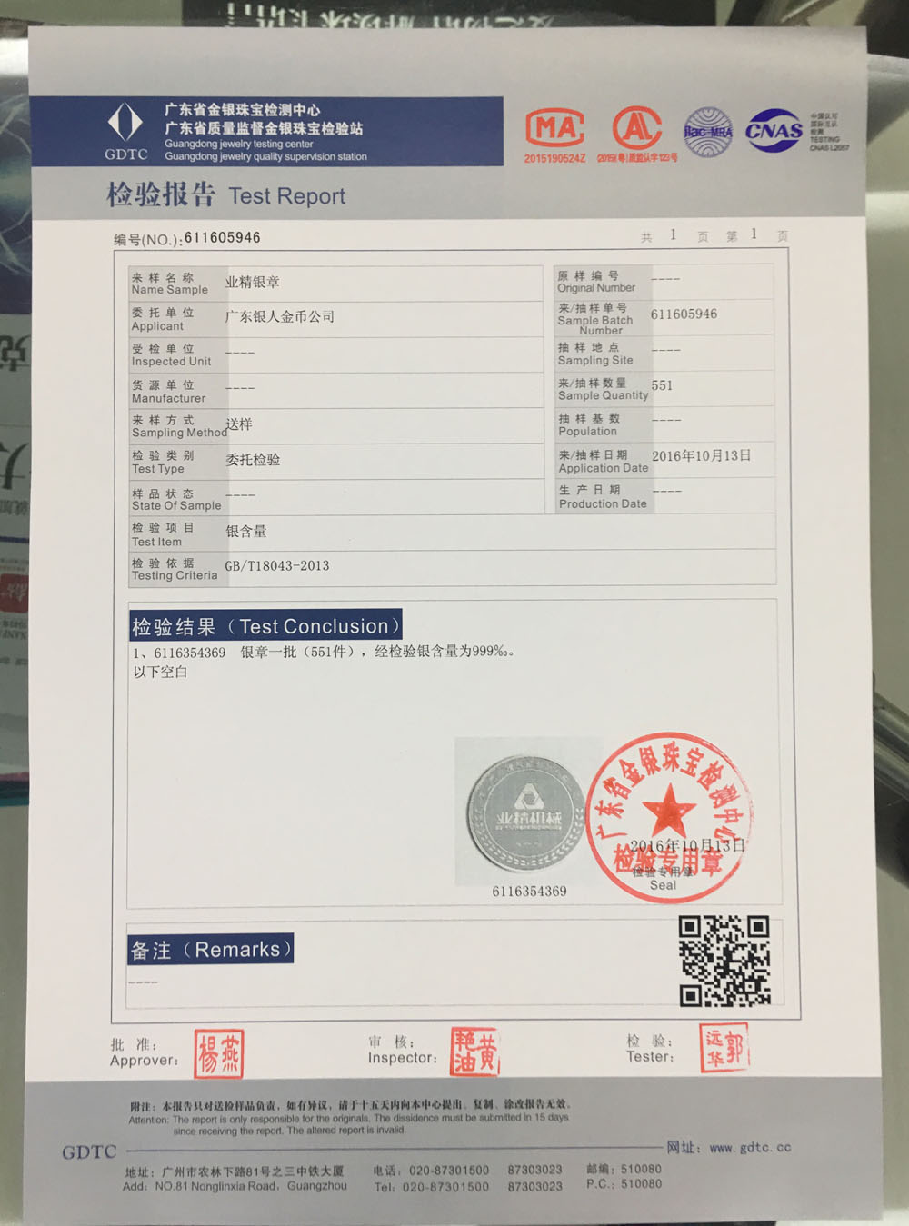 • 純銀銀牌含銀量國家權威機構檢測證書