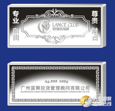 • 2013-11月:廣州藍(lán)獅投資公司Ag.999純銀500克銀磚、純銀銀卡、純銀銀條加工定制。