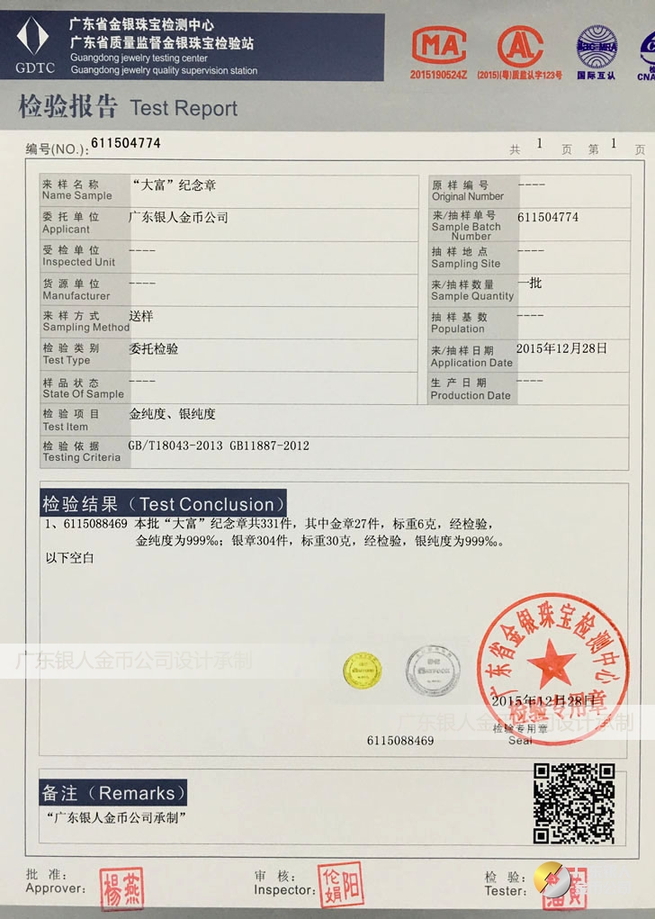 廣東銀人金幣公司承接客戶個性化定制的金銀幣、金銀章、金銀條、金銀牌、金銀盤均由國家質(zhì)監(jiān)部門、嚴格檢測、權威鑒定: