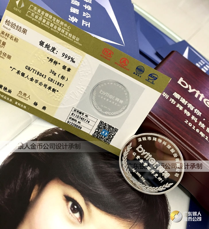 廣東銀人金幣公司承接客戶個(gè)性化定制的金銀幣、金銀章、金銀條、金銀牌、金銀盤均由國家質(zhì)監(jiān)部門、嚴(yán)格檢測、權(quán)威鑒定: