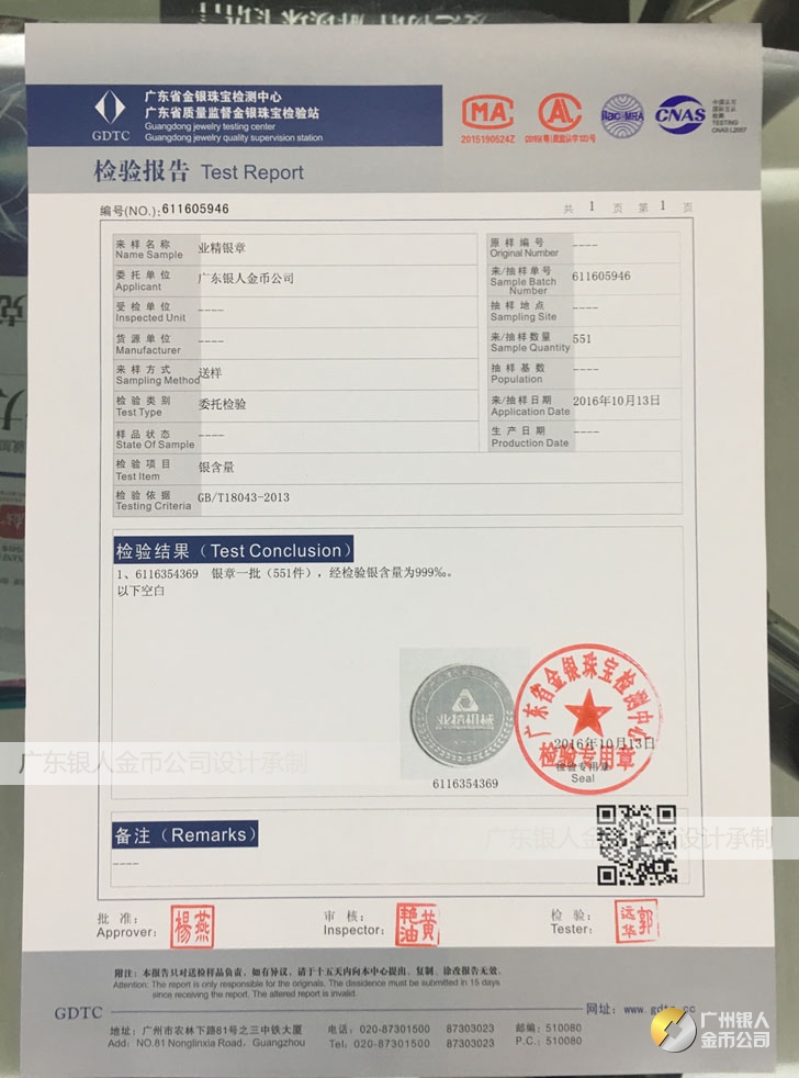 廣東銀人金幣公司承接客戶個(gè)性化定制的金銀幣、金銀章、金銀條、金銀牌、金銀盤(pán)均由國(guó)家質(zhì)監(jiān)部門(mén)、嚴(yán)格檢測(cè)、權(quán)威鑒定: