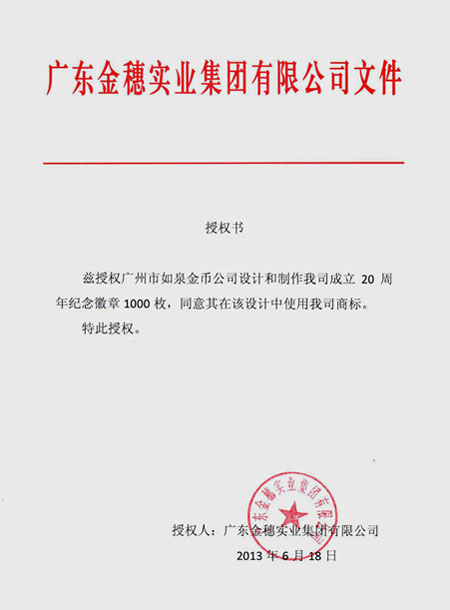 2013年6月:廣東金穗集團成立20周年金質(zhì)紀(jì)念章定做