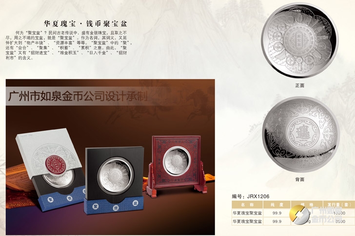 廣州市如泉金幣公司依托上海造幣廠和深圳國寶造幣廠等造幣公司以及金銀制品廠,設(shè)計(jì)定做紀(jì)念幣、紀(jì)念章、金銀幣、金銀章、金銀條,采用造幣工藝、選用千足金銀,個(gè)性定制金幣、定做銀幣、訂做金條、訂制銀條、制作紀(jì)念銀幣、制造紀(jì)念金幣、加工紀(jì)念銀章、生產(chǎn)紀(jì)念金章,純金純銀鑄造、全部國檢、權(quán)威檢測(cè)。