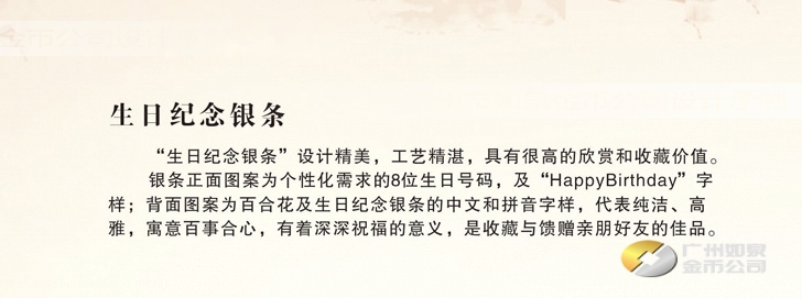 廣州市如泉金幣公司依托上海造幣廠和深圳國寶造幣廠等造幣公司以及金銀制品廠,設計定做紀念幣、紀念章、金銀幣、金銀章、金銀條,采用造幣工藝、選用千足金銀,個性定制金幣、定做銀幣、訂做金條、訂制銀條、制作紀念銀幣、制造紀念金幣、加工紀念銀章、生產紀念金章,純金純銀鑄造、全部國檢、權威檢測。